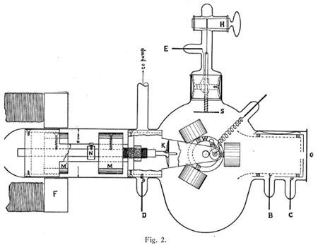 Here is the basic form of Millikan’s apparatus for measuring the photoelectric effect in a vacuum. W is the wheel with the metal samples. K is a knife for slicing the metal to get fresh surfaces. F is a movable electromagnet. Monochromatic light enters at O. B and C supply current to the Faraday cylinder – which is represented by the dotted lines and the solid line (copper gauze and solid copper) in the region of B, C and O.