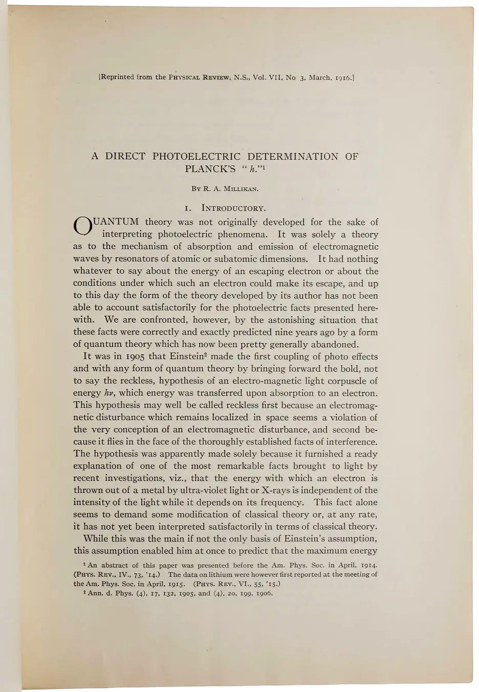The first two sentences describe how Planck’s constant was understood at the time, ie as related to the transfer of energy in relation to blackbody (heat) radiation. The third sentence brings up the photoelectric effect, ie, that light (ultraviolet and visible light as it was understood at the time) could cause electrons to leave metals – Lithium and Sodium for example. The observation that the release of electrons was contingent on the wavelength/frequency of the light and not its intensity was known at the time, but not well defined or understood. The prediction was Einstein’s proposal of the light quantum where photoelectrons would be emitted only when the light frequency was short enough, and so, powerful enough, to supply enough energy to release the electrons from the specific electromagnetic barrier that varied according to the metal. This required release energy was called “the work function.” So, in relation to Planck’s h, Einstein proposed that the maximum kinetic energy of the released electron would be equal to Planck’s constant times the light frequency minus the work function. Therefore, if you could determine the energy of the electron and the work function, you could determine Planck’s constant as long as you also had good measurements of the light frequencies involved and excluded the effects of reflected light, oxidation and interactions with other metal surfaces. The last sentence in Millikan’s first paragraph, about the astonishing situation, really is astonishing since I don’t think Einstein ever gave up on the light quantum, though by 1916, he was more involved in completing the theory of General Relativity.